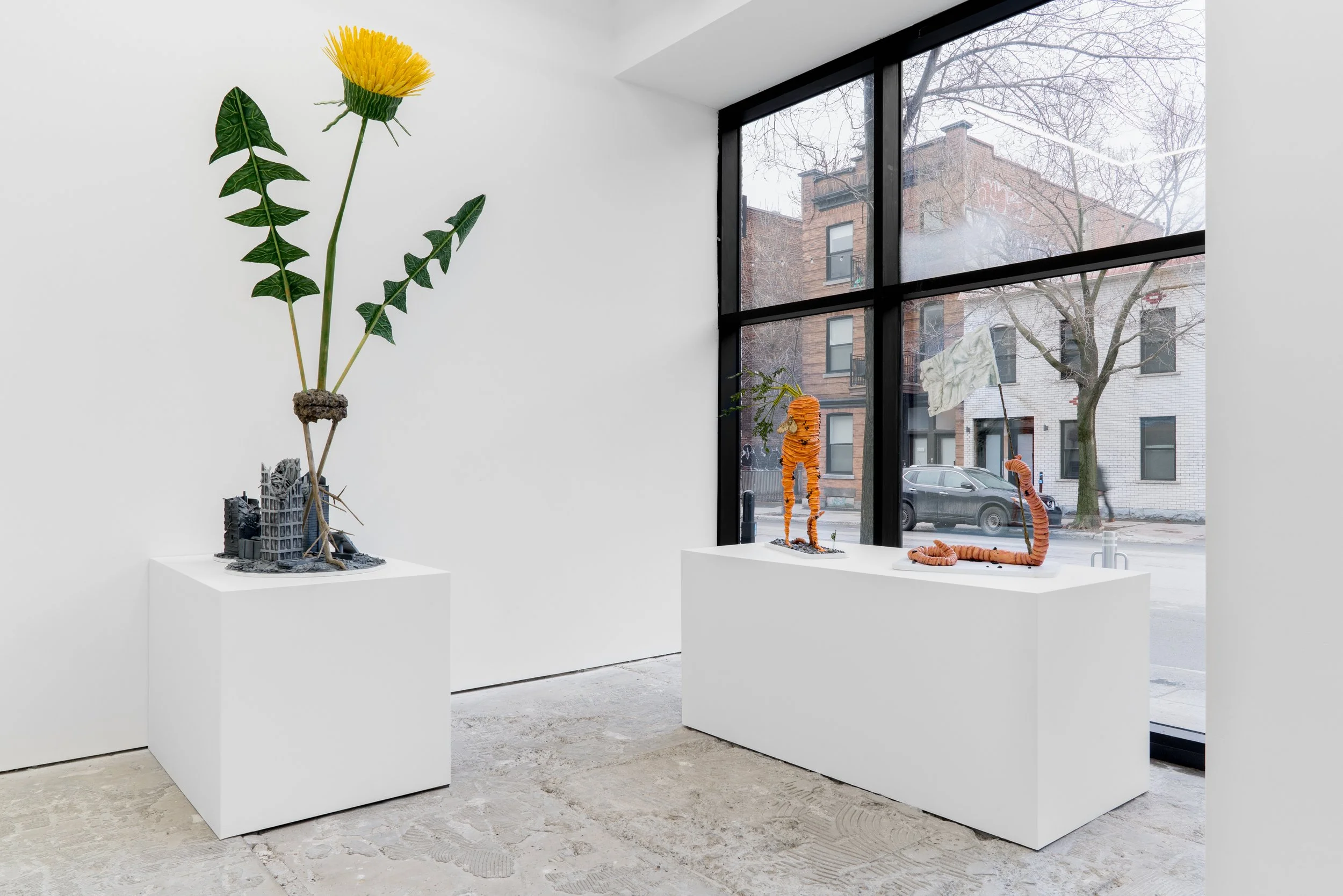 An oversized dandelion walks across the rubble of a collapsed city. An earthworm waves a flag of surrender in the wake of chemical fertilizers. A garden carrot proudly walks through microbial soil, bearing its irregularities and rejecting the homogeneity of the supermarket shelf. Fallen leaves with human faces represent portents for humanity’s decline.